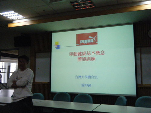 主講人是台大田徑隊的教練簡坤鐘副教授(台大田徑隊在大專盃乙組成績相當優異),