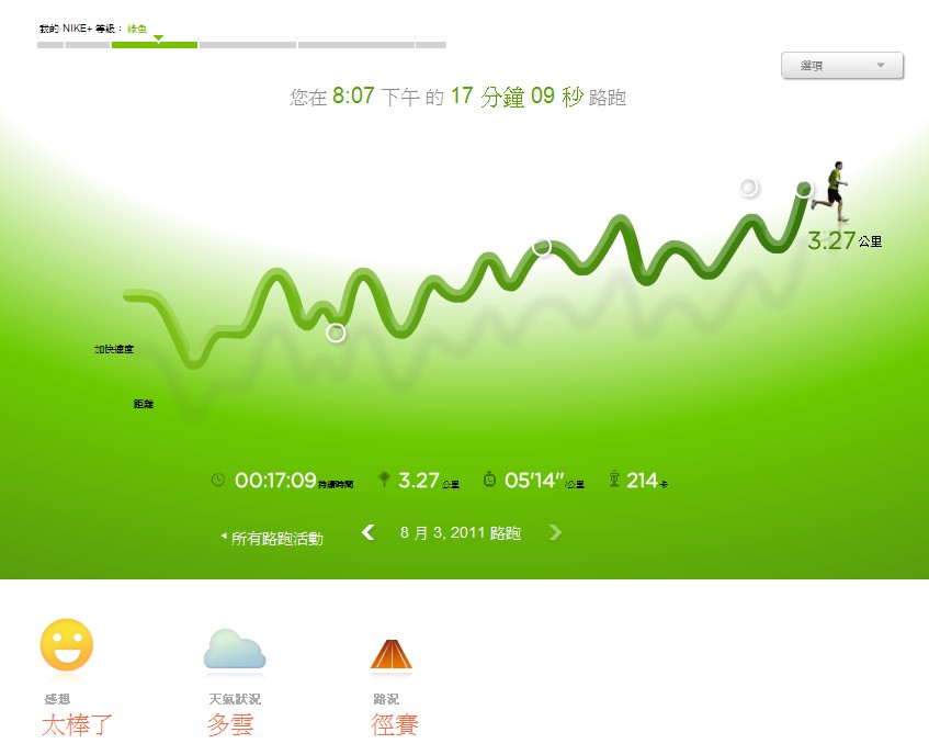 今天由慢至快,繞田徑場跟大家跑5圈,最後一圈教練說要緩跑走,結果自己加點速度,在終點跟大強哥一起衝線。